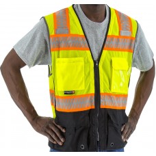 Two-tone heavy duty ANSI Class 2 surveyors vest with high visibility piping around edges for increas..